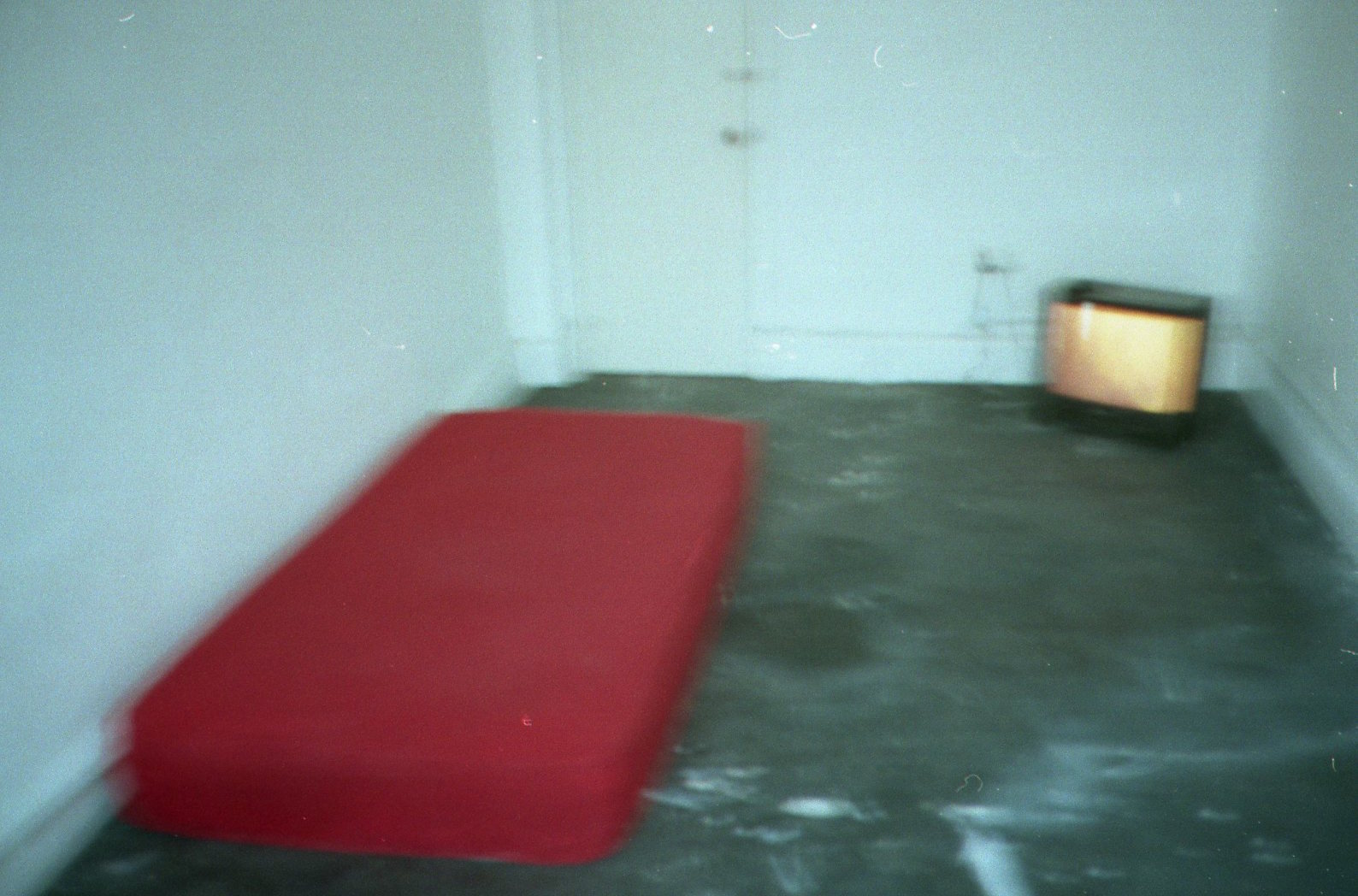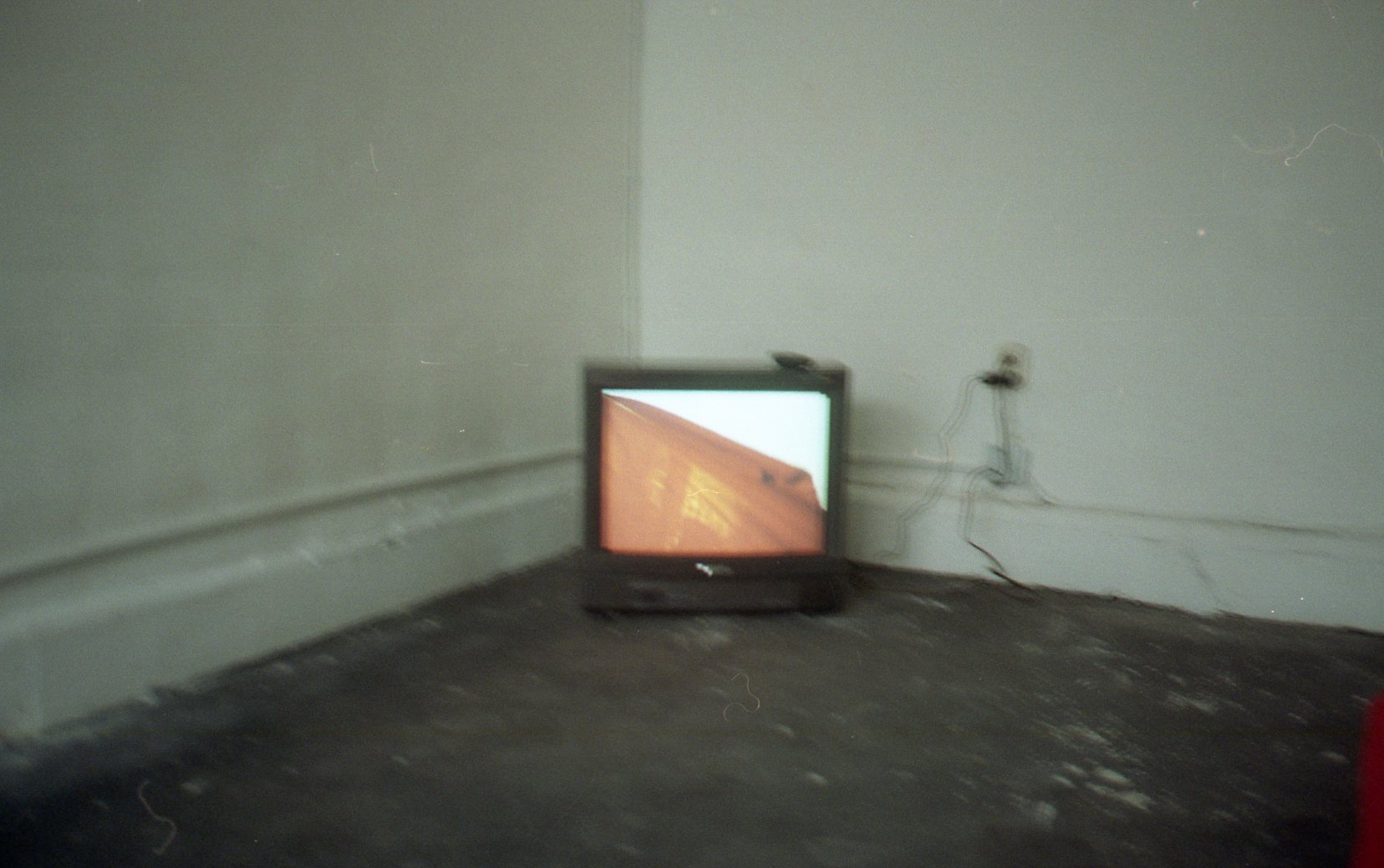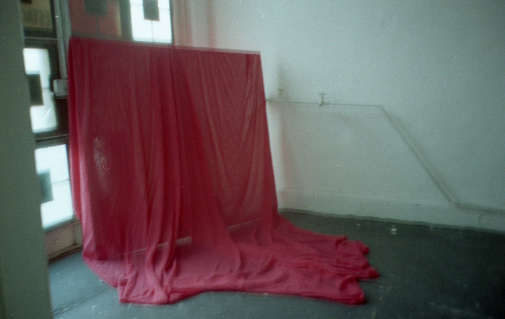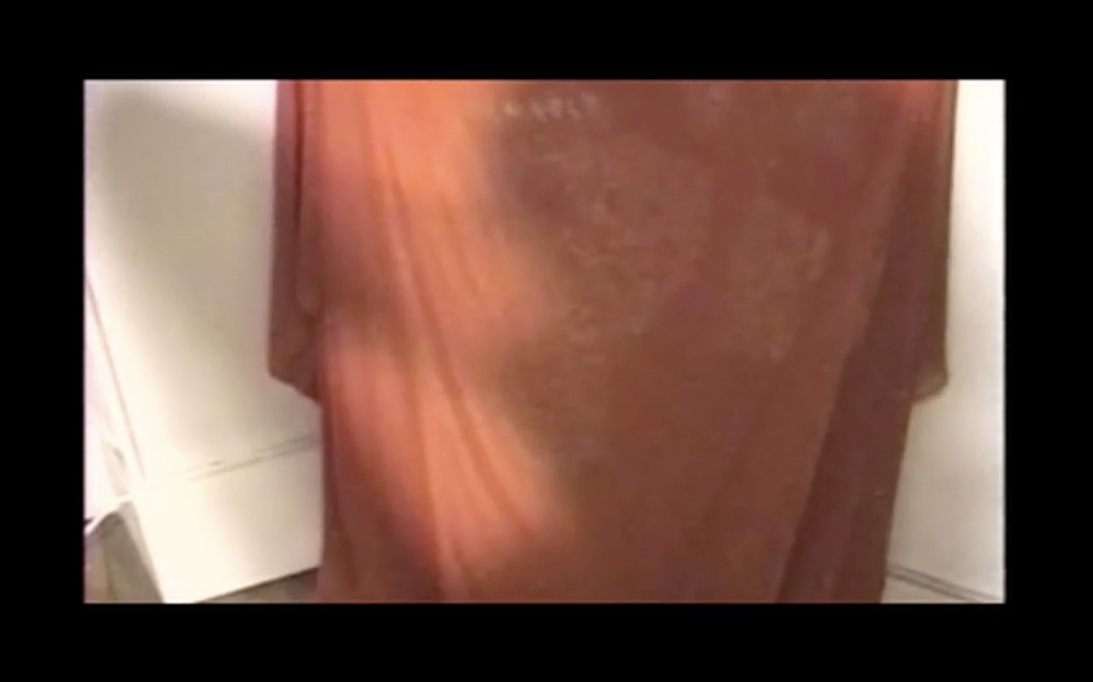 language and representation is a video piece where the artist moves naked while filming herself in the reflection of a mirror covered with red sheer fabric.